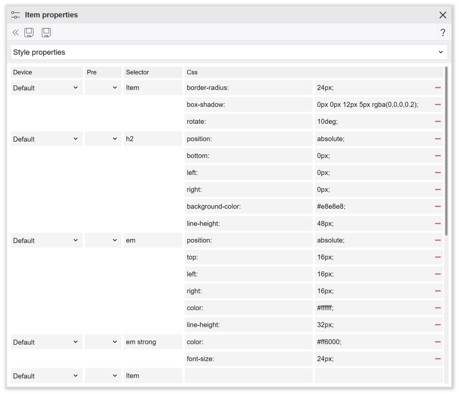 You can override template styles (CSS) with the item Style properties tool. Separate styles can be applied for desktop, tablet and mobile devices.